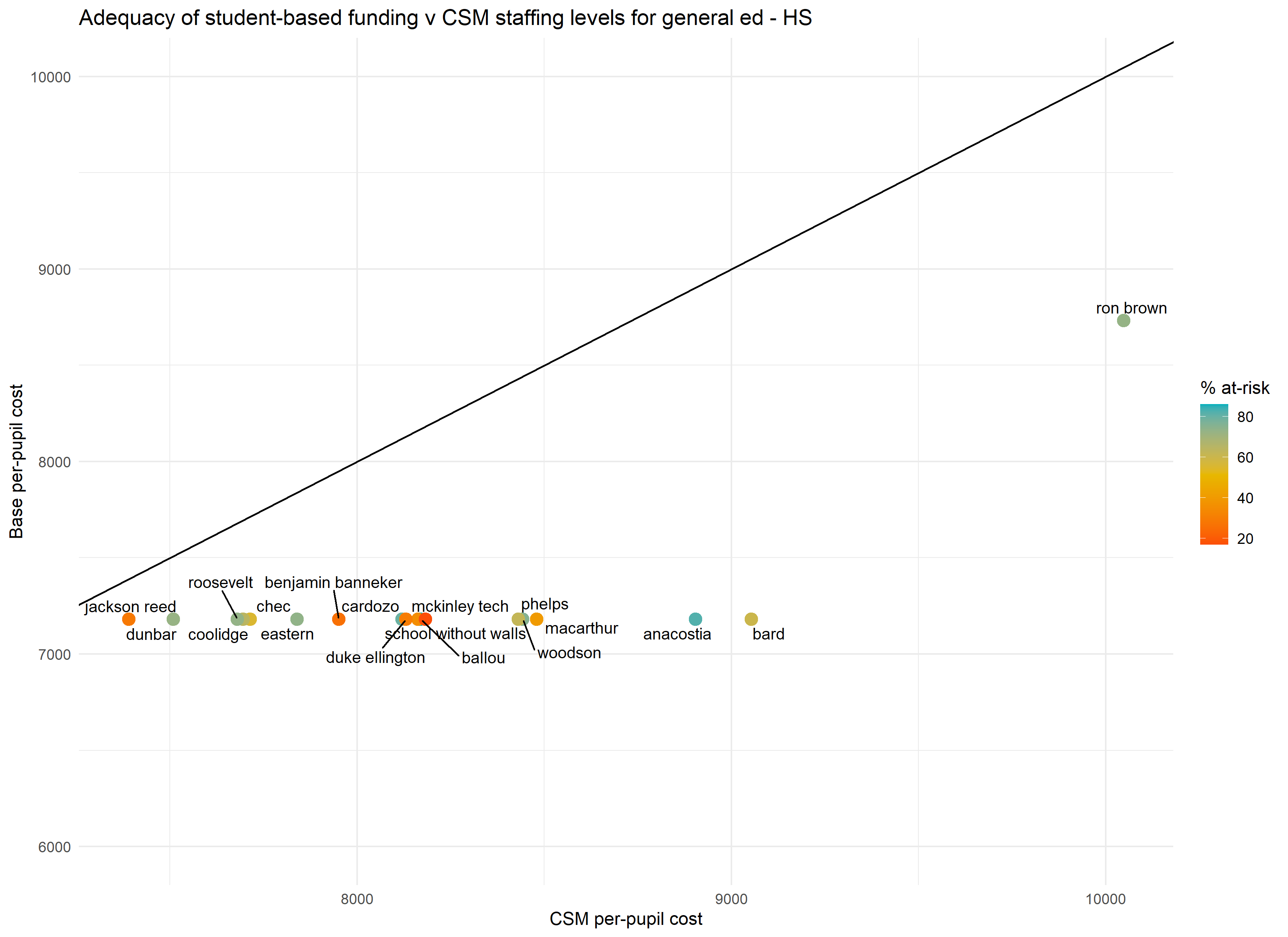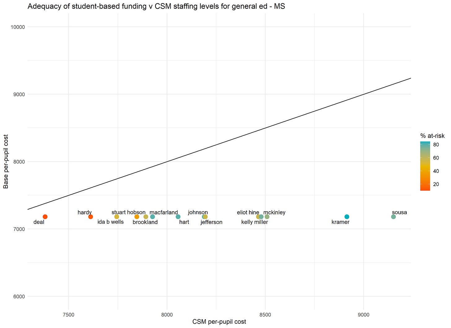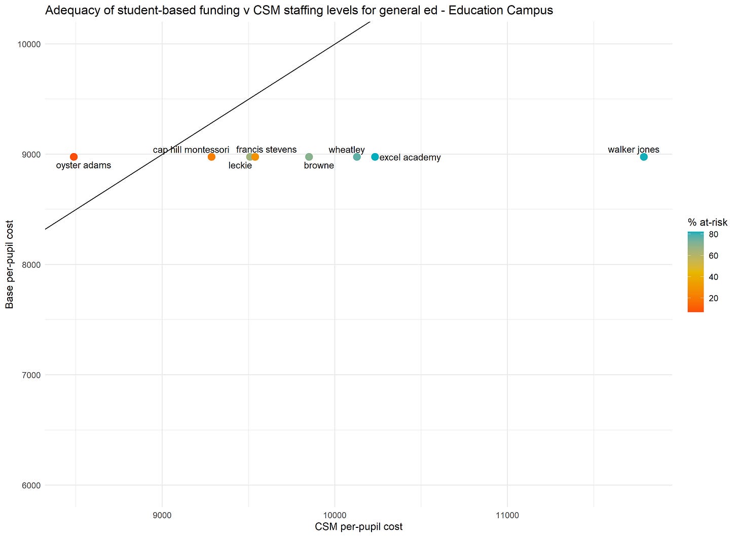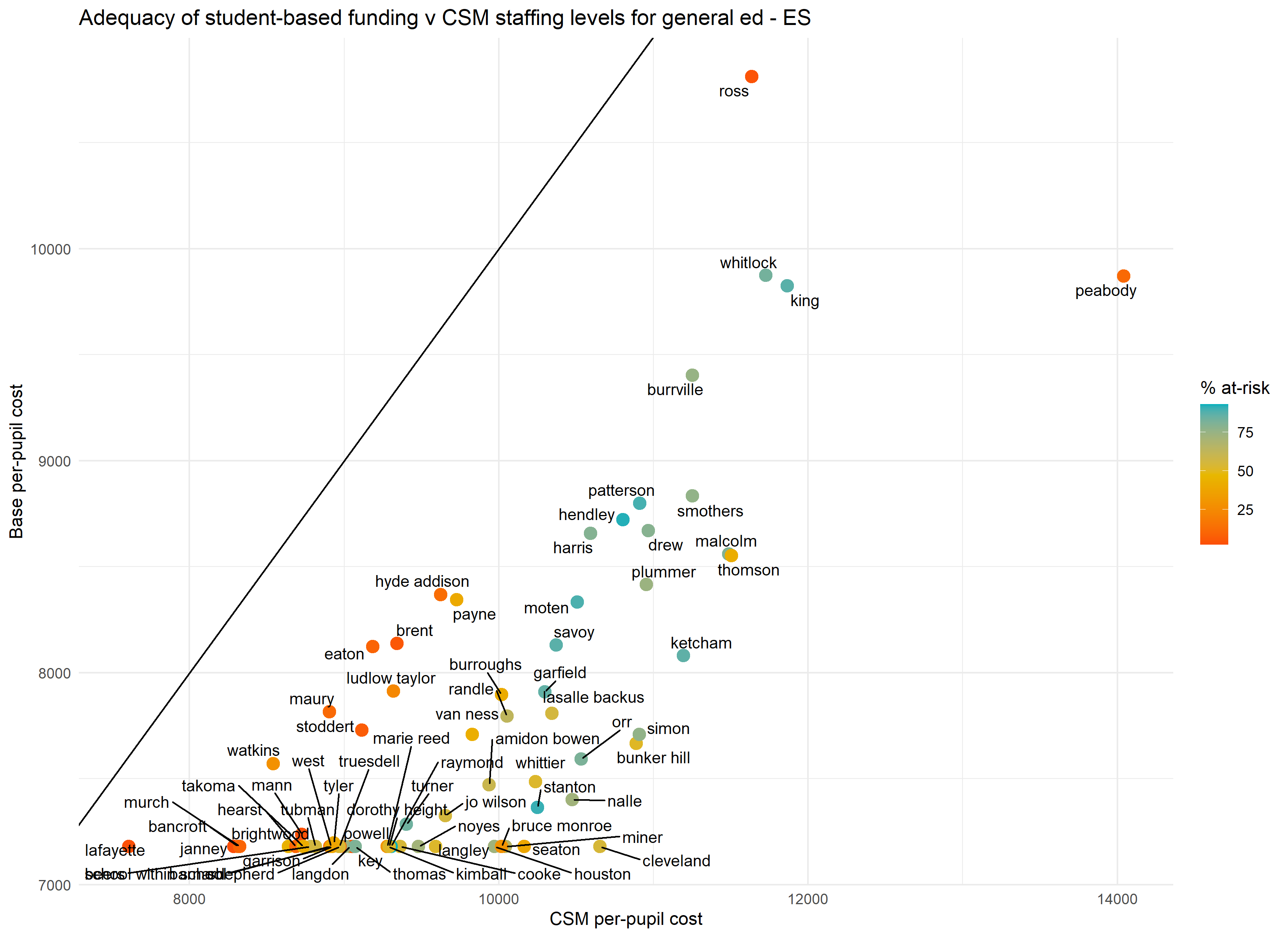 In other words, does the new budget model fund the very bare minimum to cover general ed teachers, assistant principal, instructional coach, etc. in its base allocations? And the answer is no. In virtually all schools, the base funding (student-based weighted formula and safety net) is less than the CSM staffing levels. The line shows the CSM funding, so schools below the line (vertically or to the right of the line) are receiving less funding for the bare minimum general ed staff than was allocated by the CSM.