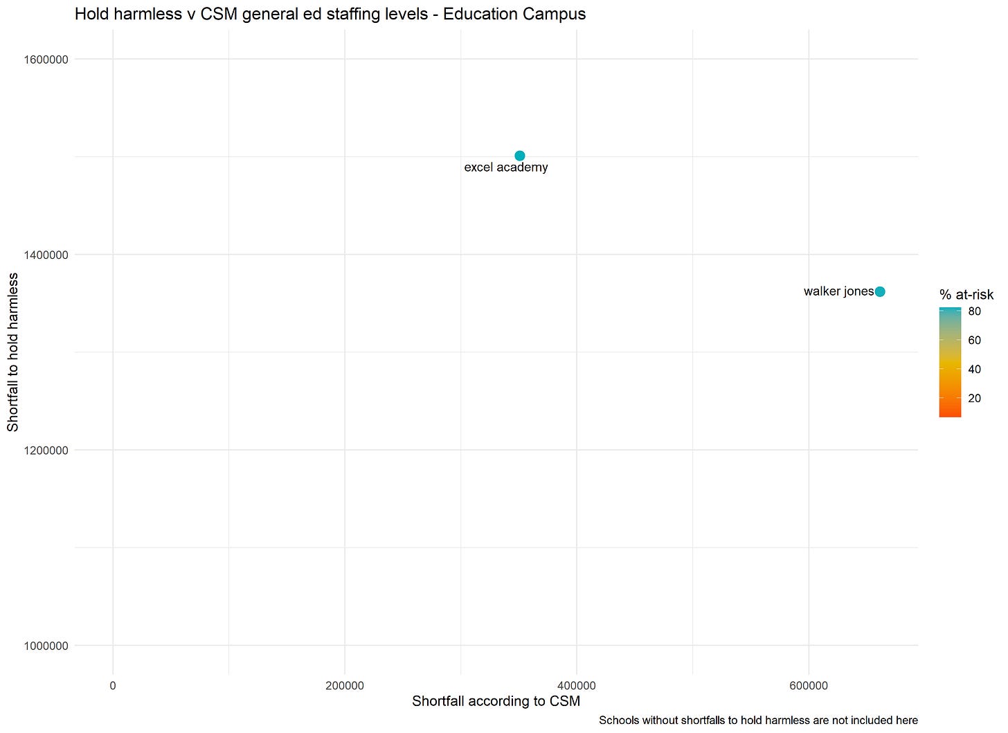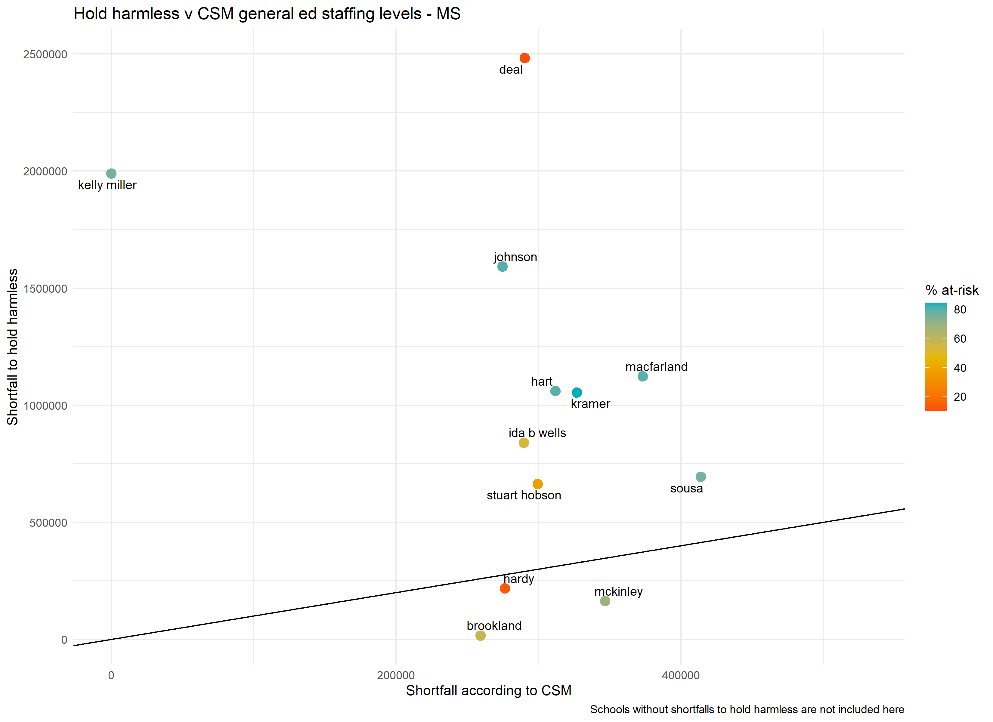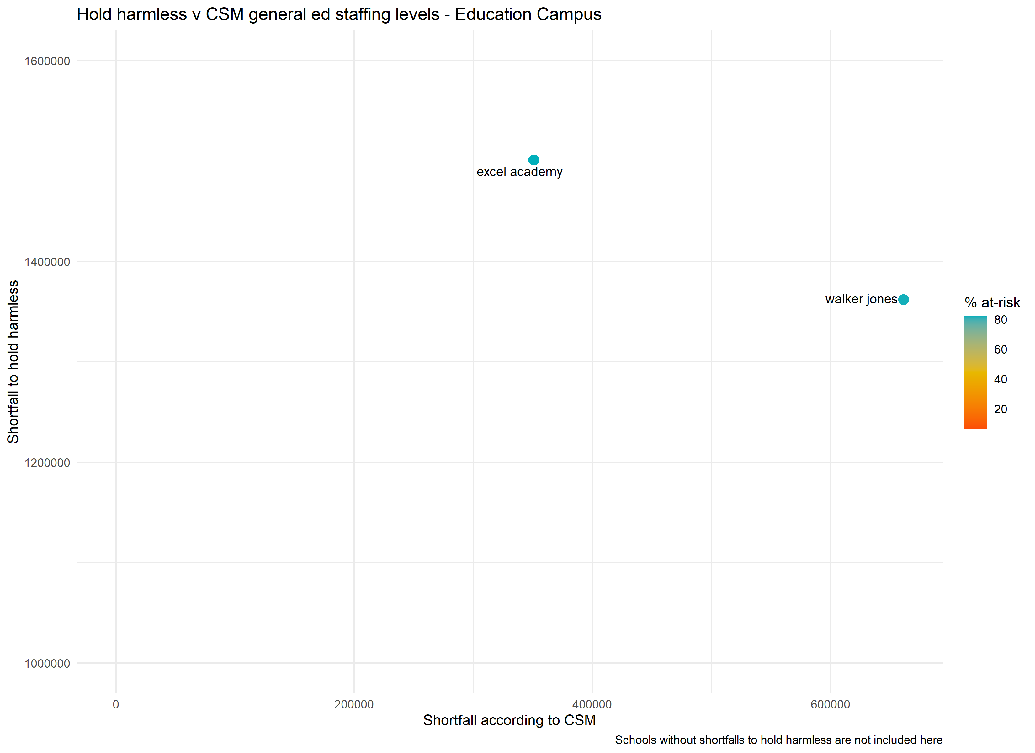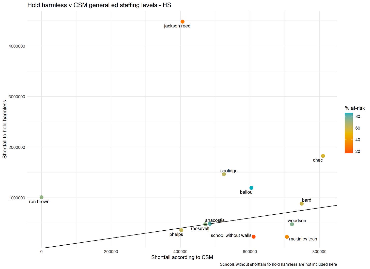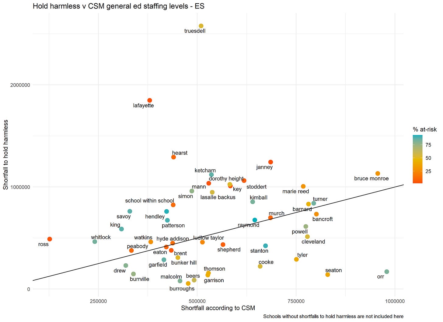 The answer is both. The graph below shows the shortfalls to hold staff harmless from last year (y-axis). The graph also shows the shortfall under the simulated CSM staffing levels for the minimum general ed staff (x-axis). Keep in mind that schools may have received specialty funds, above and beyond the minimum, that is not captured in the CSM minimum. Any school above the line vertically has more staff than the CSM minimum staffing level, and any school under the line has less staff than the CSM minimum staffing level. The graphs show that for schools facing shortfalls to hold harmless, about 60% had additional staff above and beyond the minimum staff allocated to all schools under the CSM. At the same time, the graphs also show that all schools facing shortfalls to hold harmless had inadequate funds for the minimum general ed staff under the new budget model. So, while DCPS’s new budget model is underfunding the minimum general ed staff for all schools, most schools facing shortfalls to hold harmless also had more staff than other schools to begin with.