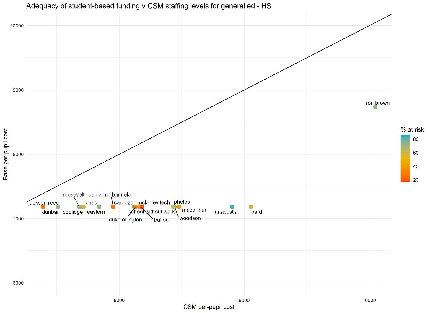 To try to disentangle some of this, Mary Levy and I calculated to what extent the new budget model covers most of the bare minimum general education staff according to DCPS’s prior comprehensive staffing model (CSM), and to what extent schools facing losses in purchasing power had more than the CSM to begin with. (See data notes for specifics). But let’s back up…