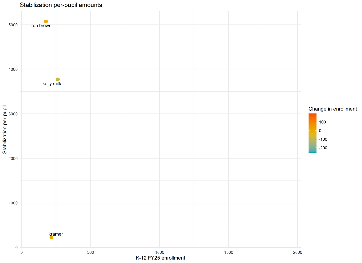 In addition to base funding, DCPS adds “stabilization” funding for schools facing large swings in enrollment, based on the 95% rule, or that no school can receive less than 95% of its budget from the previous year.