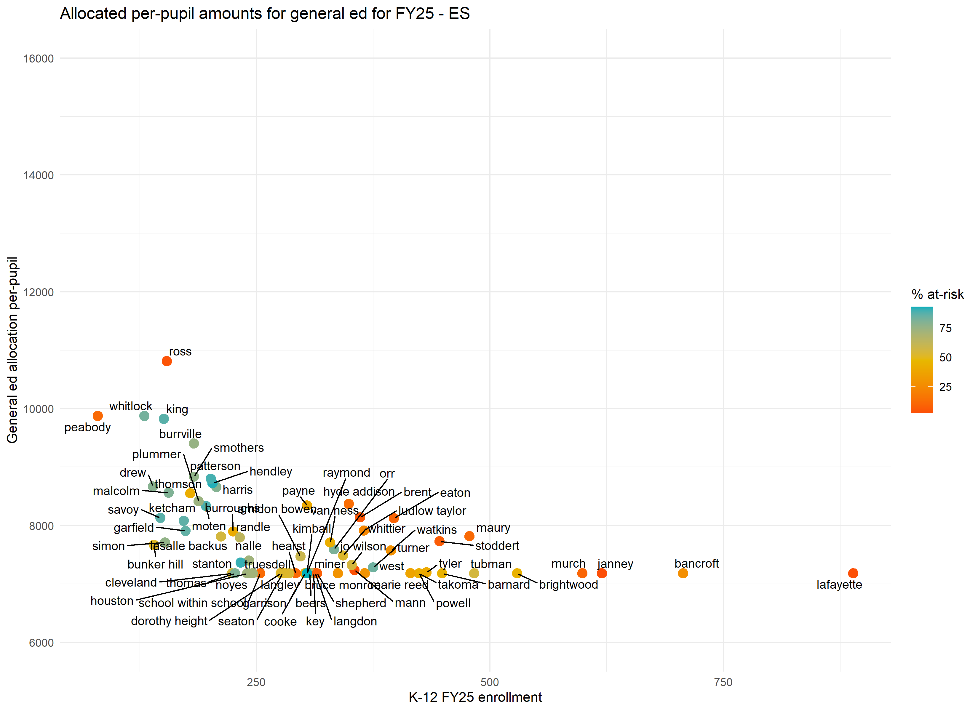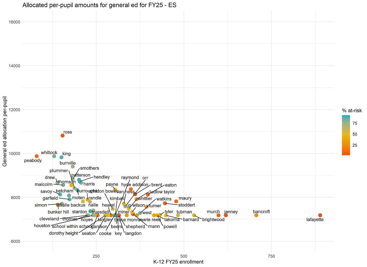 So what now? We need to advocate that DCPS gives schools enough money to fund the bare minimum, without schools needing to use their flexible “at-risk”, special education, English learner, or early childhood weighted funding. This is an easy talking point, and it will help with the budget shortfalls. While we should continue to advocate for stability, we should also advocate for equity in additional resources across all schools, above and beyond the base.