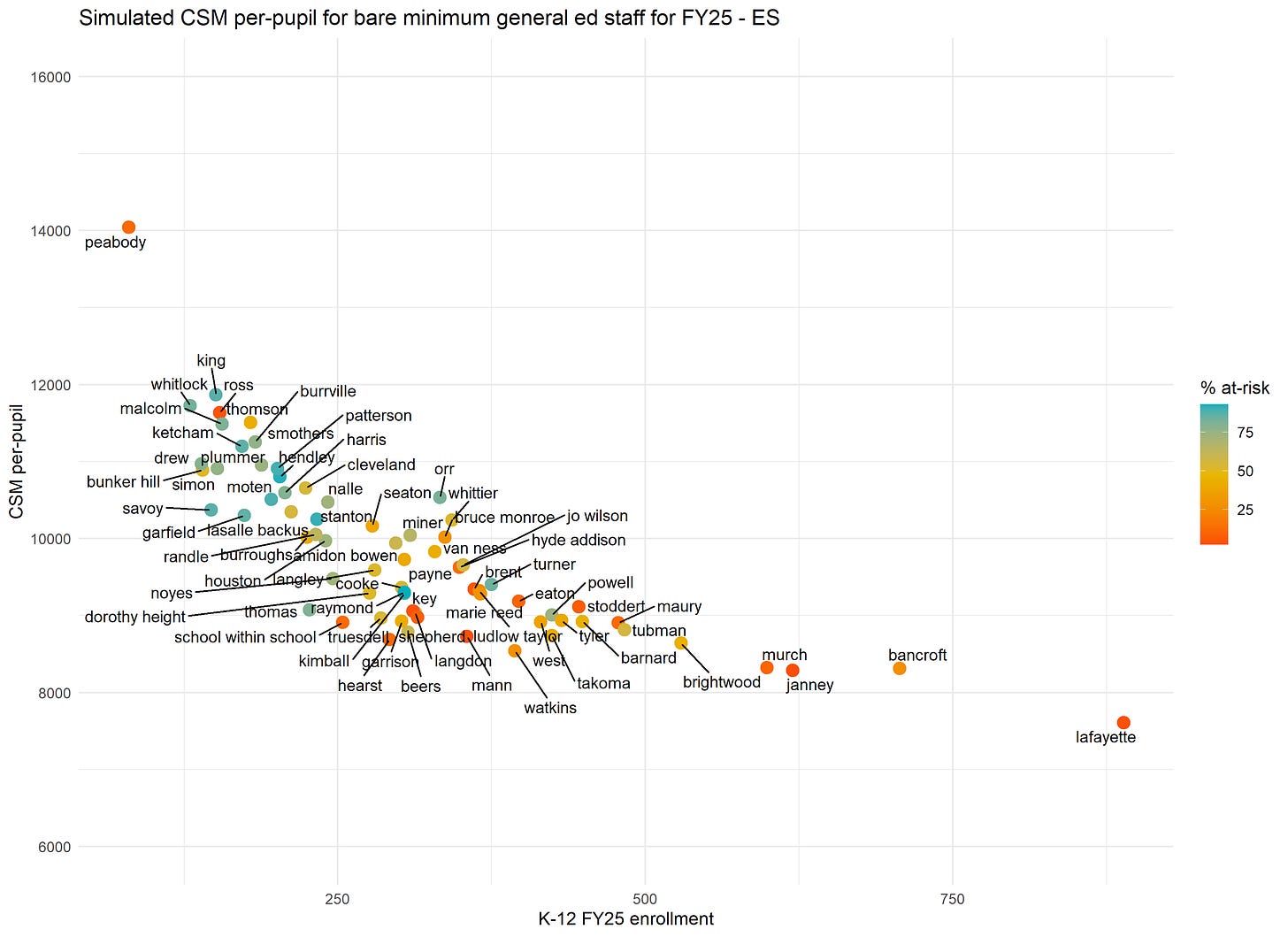 To be clear, the CSM is the bare minimum, and this is not desirable for any school. But if some schools receive extras — such as additional related arts teachers, world language teachers, science teachers, and specialty programs — then shouldn’t we at least consider who has access to these resources, and if the extra resources are allocated equitably? I do not begrudge any school for having additional personnel, but if it leads to vastly unequal opportunities (and we know that it does from the submitted budgets), then we should advocate not only that DCPS maintain budget stability, but also that DCPS funds additional staff in all schools so that all students have equal opportunity to the same resources.
